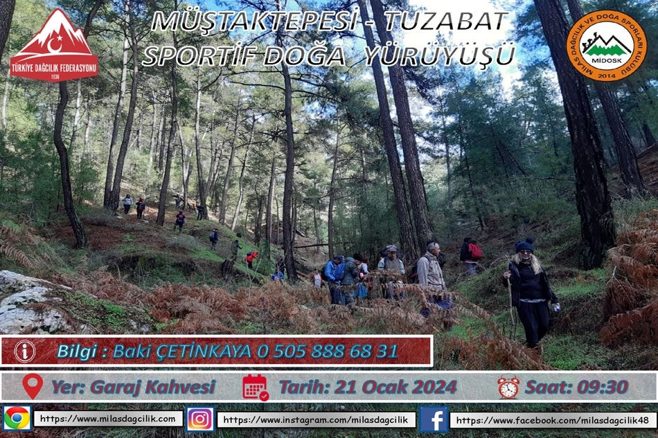 Bu hafta MÜŞTAKTEPESİ - TUZABAT parkuru ile yürüyüşlerimize devam ediyoruz. ORTA ZORLUKTA PAKUR yaklaşık 12 KM uzunluğunda, etkinliklerimize katılan üyelerimizin zorlanmayacağı bir etkinliktir.